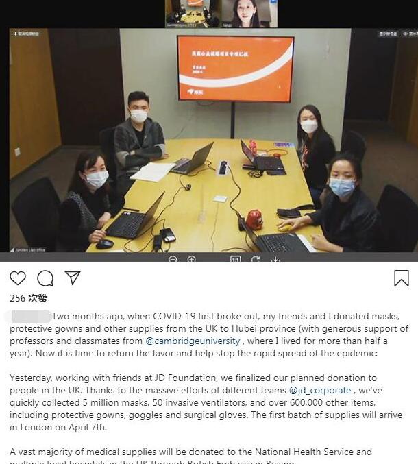 4月2日,刘强东夫妇和京东宣布通过中华慈善总会向欧洲疫情严重且华人华侨和留学生人数众多的英国捐赠500万只口罩、50台有创呼吸机及60余万件防护服、护目镜、医用手套等医疗物资,首批物资将于4月7日运抵英