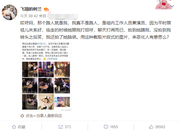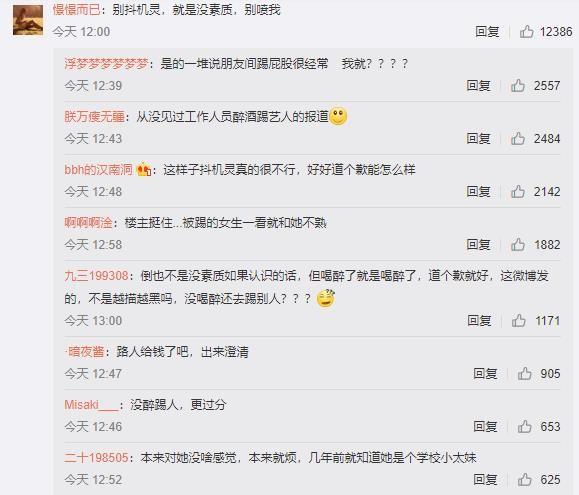 视频曝光后在网上引起轩然大波,网友纷纷斥宋祖儿借酒发疯,没素质,但是随后一位自称“被踢者”却发文澄清,称自己是剧组工作人员兼演员,平时跟宋祖儿关系很好,动图中二人是在打闹,还斥责狗仔断章取义,故意恶化人“只拍到她踢我,没拍到我转头之后笑,我还拍了她脑袋”。