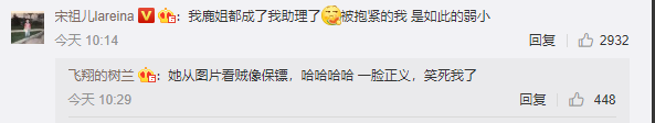 宋祖儿在她的微博下评论:“我鹿姐都成了我助理了,被抱紧的我,是如此的弱小。”