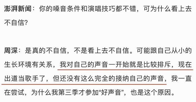 但周深对自己的声音从来没有自信过,他在很多采访里都有提过,很长一段时间,他对自己的声音很排斥,害怕在人前唱歌。