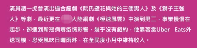 因为没有经纪人,所以任何演出机会都是赵一虎独自争取的,前一段时间他凭借自己的努力争取到了网剧《极速风云》的男二。原本事业正在慢慢起步,前途一片光明,但由于近日经济不景气,赵一虎几乎毫无戏约。不过这并没有打倒赵一虎,作为名气一般的演员,他平日有很多空档。2019年9月起他开始兼职当外卖员,如今没有戏约,他更是全身心投入到外卖行业,赵一虎坦言:“演员有很多的空档,做外送是赚取生活费来源的方法。”在心浮气躁的娱乐圈呆久了,赵一虎并没有养成趾高气昂的态度,能屈能伸,这一点值得肯定。