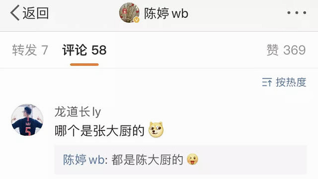 在这条博文下方有网友问道:哪个是张大厨的?陈婷则回复说:都是陈大厨的。可见陈婷出得厅堂也入得厨房,有着一手好厨艺。