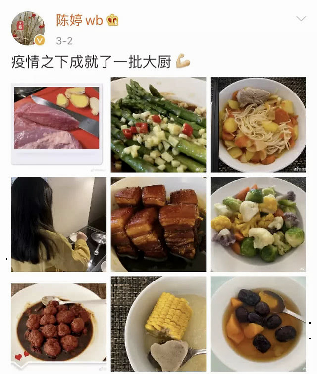 翻开张艺谋妻子陈婷的个人社交动态,她在3月2日发了一组美食照片,并配文写道:疫情之下成就了一批大厨。通过照片可见,各式的菜肴色香味俱全,一看就是精心制作的一顿饭。