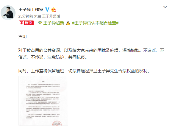 工作室称:“对于被占用的公共资源、以及给大家带来的困扰及麻烦,深感抱歉。不造谣、不信谣、不传谣,注意防护,共同抗疫。同时,工作室将保留通过一切法律途径捍卫王子异先生合法权益的权利。”