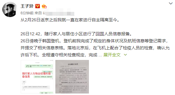 对此,王子异于2月28日发文进行回应,他表示:“从2月26日返京之后我就一直在家进行自主隔离至今,在返京前随行家人与居住小区已进行了回国人员信息报备,回到小区时,因车辆信息确认问题,随行家人与安保、社区进行了三方沟通确认,同时安保也进行了相关车牌号、人员信息登记,随后配合了小区设置的健康检查,并没有超过37.3度。”