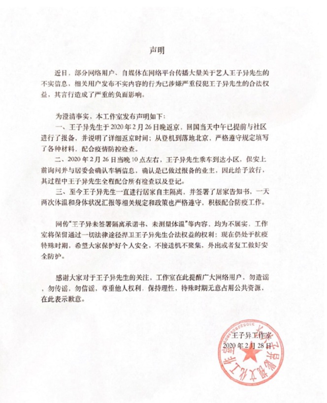 稍晚,王子异工作室也发布声明,澄清网传王子异进入小区不配合接受检查的传闻,并表示将保留法律追究权利。
