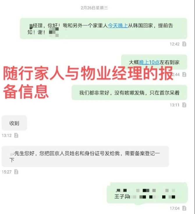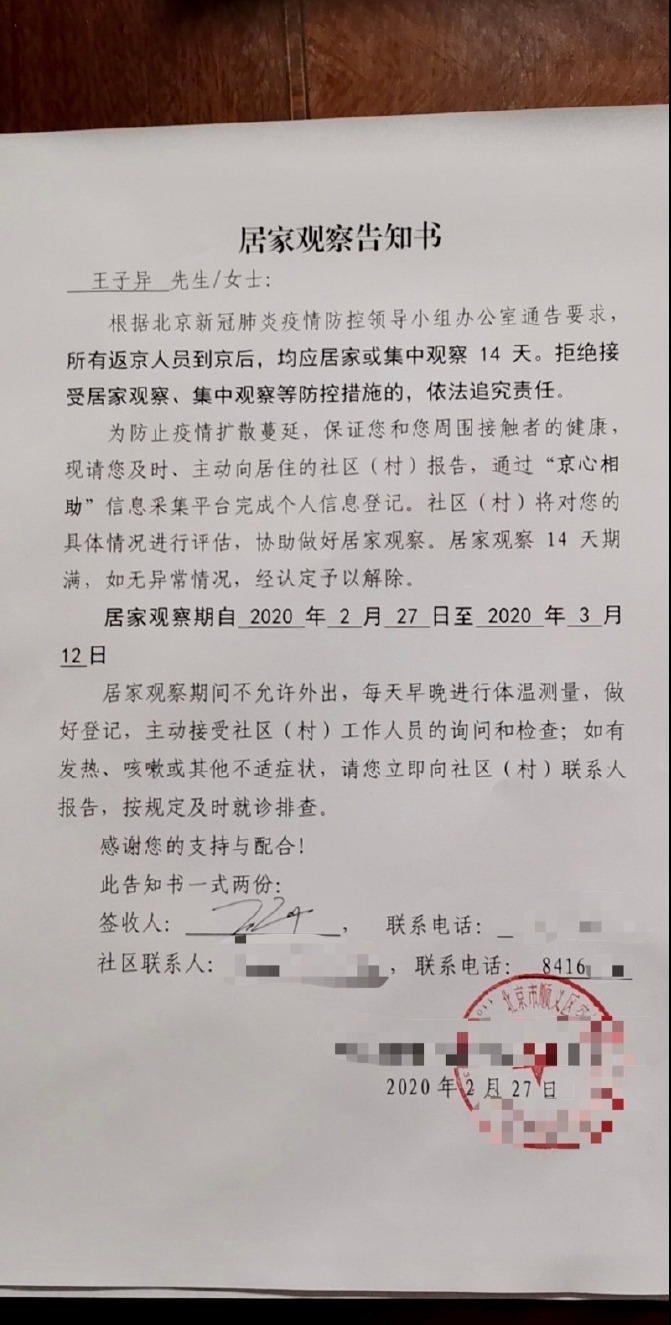 最后,他还晒出了与物业经理的聊天记录及在家完成签署居家观察告知书的图片,并表示:“这两日一直在家隔离,同时按照规定每日两次测量体温并拍照报备给对应的负责人。这次返京全程及现在自主隔离期间我和身边家人都在积极配合相关检查报备以及自检工作,疫情当前我们积极配合,这既是对自己负责、也是对他人负责。”