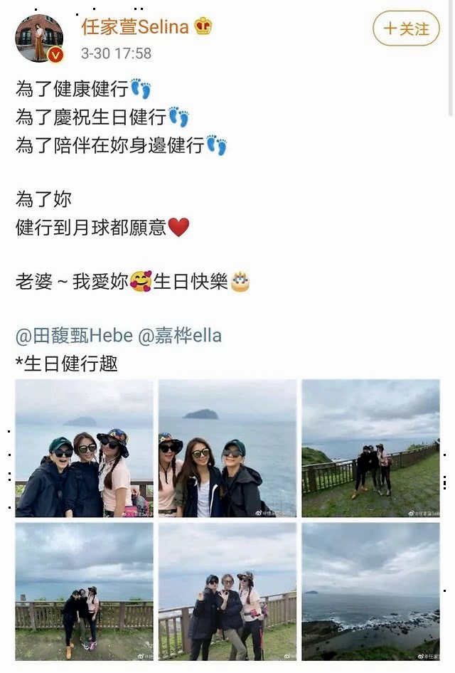 3月30日是Hebe田馥甄的生日,好姐妹Ella和Selina分别在社交网络上送祝福,并晒出了3人一起相约爬山庆生的照片,蓝天白云,3人的情感一直未变,而Hebe也已经37岁了。