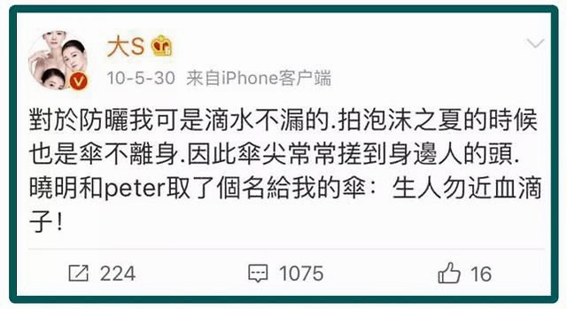 2010年时,她还在个人社交平台公开说过这个话题,大S拍《泡沫之夏》时因为总是打着遮阳伞,还被剧组其他人取了个名字给她的伞:生人勿近血滴子!