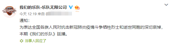 4月3日,《我们的乐队》官方微博发布节目延播通知,表示:“为表达全国各族人民对抗击新冠肺炎疫情斗争牺牲烈士和逝世同胞的深切哀悼,本期《我们的乐队》延播。”