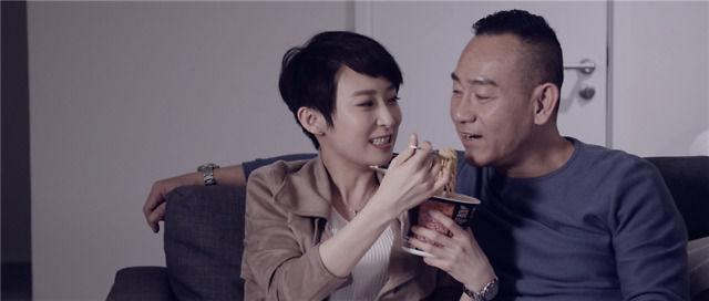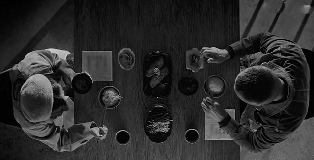 两个人吃饭时,没有温馨,有的只有一面厚厚的石灰墙。