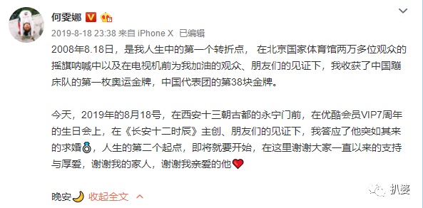 2019年8月,何雯娜微博宣布被求婚成功,顺便替梁超的作品长安十二时辰做了个绝佳的宣传(至于到底哪个才是顺便,只有当事人心里清楚了)。