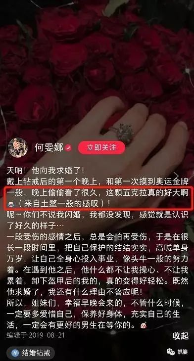 求婚戒指五克拉大钻戒,收到戒指时的心情和摸到奥运金牌一样激动。