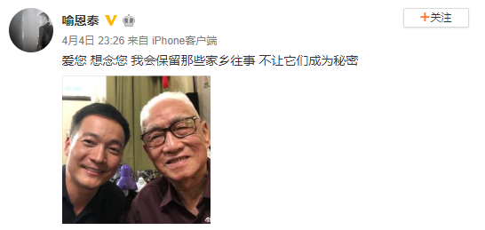 演员喻恩泰在当晚晒出与饶平如先生的合影悼念,他发文写道:“爱您,想念您,我会保留那些家乡往事,不让它们成为秘密。”