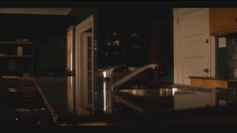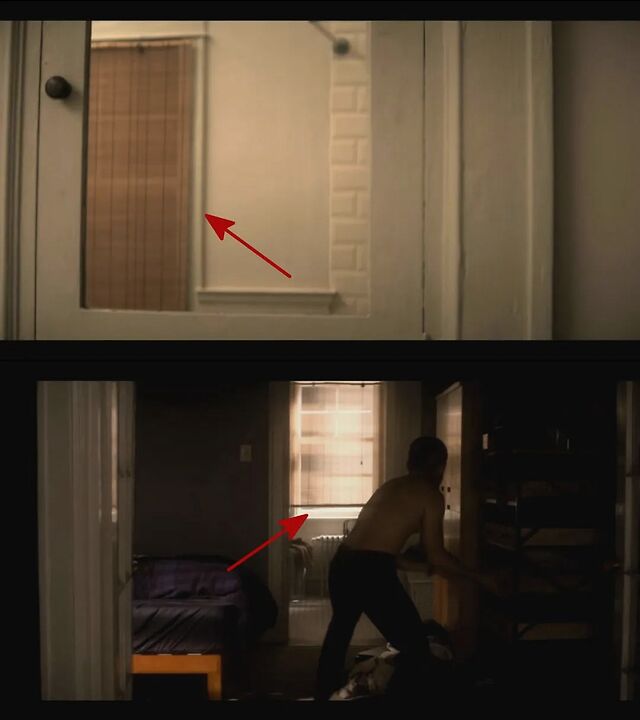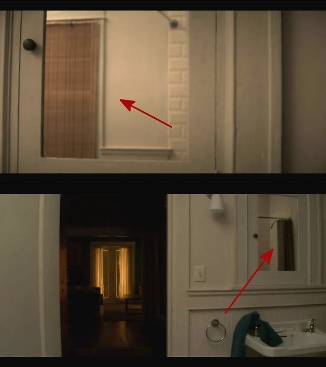 第一幕镜子中映射的是竹席材质的窗帘, 第二幕镜子中出现的才是浴帘。