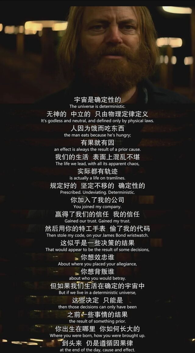 后续,他通过Devs预测出小塞的间谍活动, 在将小塞堵杀前的独白,则完全点明了 他的观点 。