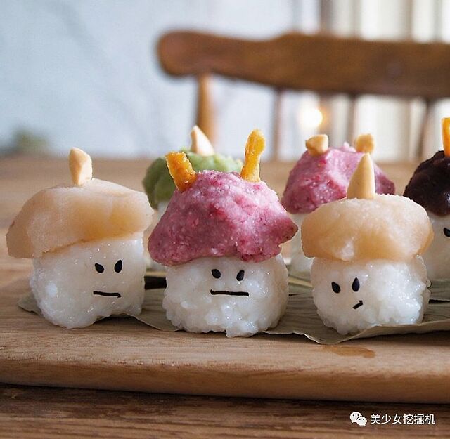 可爱的小恶魔在inamorim手里也变得色彩缤纷,小恶魔的头发是彩色的,食材也是由饭团、芝麻、花生、抹茶粉、草莓酱、红豆酱组成,孩子们会选择先吃哪一个。