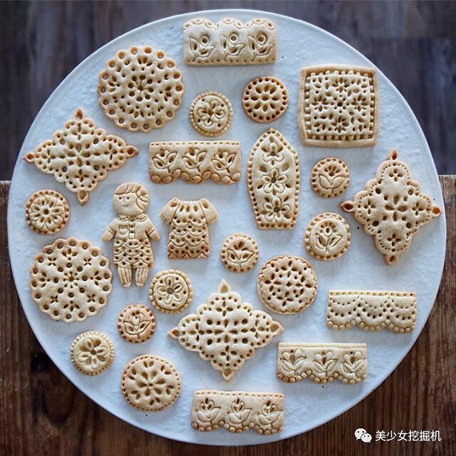 又或者古董花边的曲奇饼干你见过吗?在inamorim的手中一切都皆有可能,在圆形、正方形、四边形等曲奇饼干的边缘做成复古的花边状,不仅有童趣还有一丝年代感。