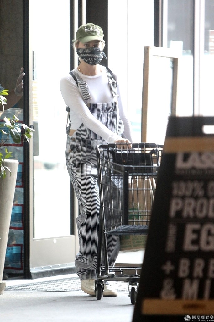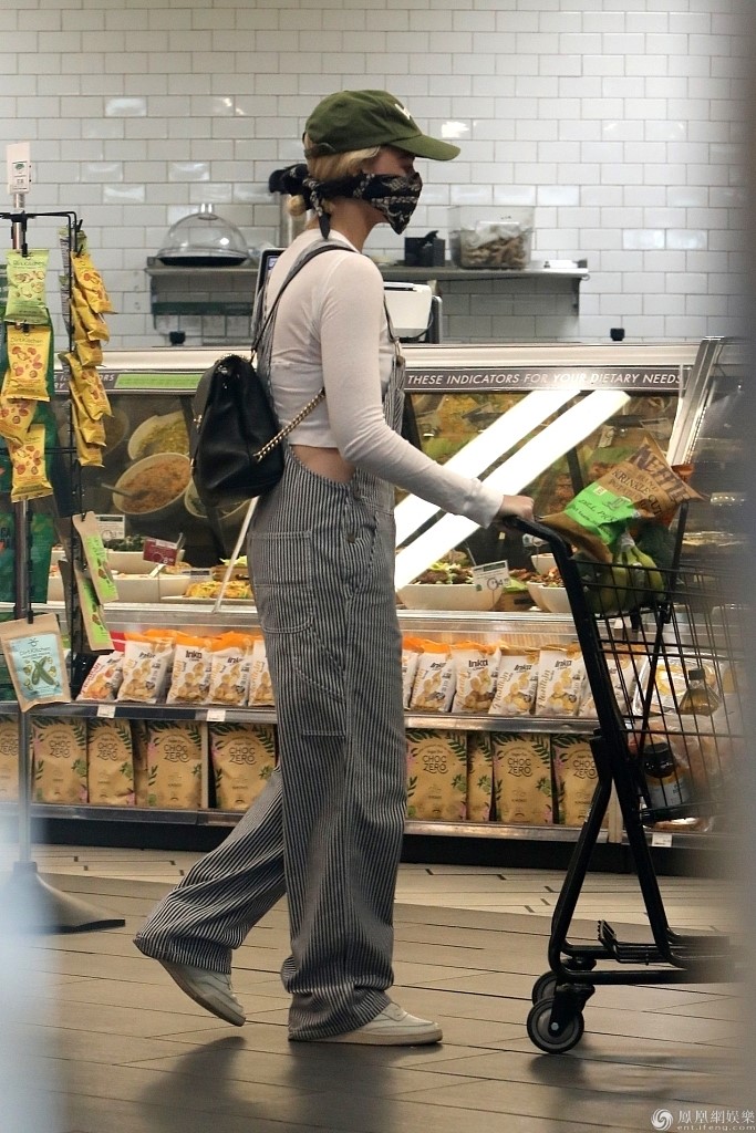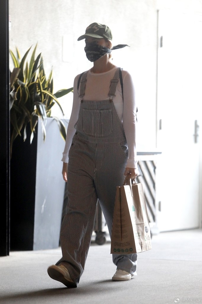 玛格特·罗比戴棒球帽穿条纹背带裤,搭配双肩包可爱减龄,不戴口罩用头巾蒙面代替。