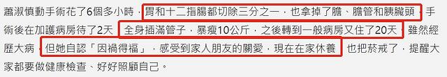萧淑慎透露动手术花了6个多小时,胃和十二指肠都切除三分之一,也拿掉了胆、胆管和胰脏头,术后在加护病房待了2天,全身插满管子,经历了这次手术的萧淑慎暴瘦20斤。