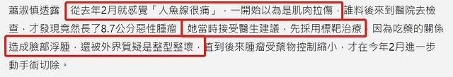 萧淑慎说在做手术之前接受医生的建议,花费了半年多的药物治疗,吃到脸部浮肿身体状态不佳,内分泌紊乱等等问题。但当时因为药物原因面部浮肿的萧淑慎还被外界质疑是整形失败。