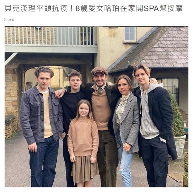 4月5日,据台媒报道,贝克汉姆一家人居家隔离乐趣横生,老贝理平头抗疫,8岁的女儿小七在家开起了美容院帮老爸按摩,还cos电影院服务员,老二罗密欧和三儿子克鲁兹则一展厨艺,有这么可爱的孩子们,维多利亚和贝克汉姆在家可是天天享福