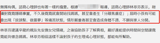 近日也有心理师对辛龙女儿的状态表示担忧,因为对于去世的事实,是不可能永远瞒住的,不久之后,霓霓就会开始找妈妈,严重的情况甚至会引起“分离焦虑症”,毕竟今年的霓霓才只有4岁,对妈妈还是有很大的依赖。