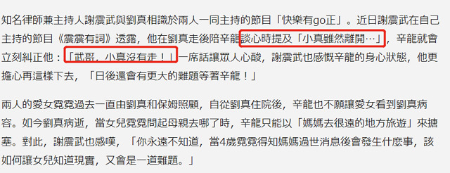 近日,辛龙的朋友谢振武在主持节目时提到了刘真的事情,说起“小真虽然离开……”等话语,辛龙都会及时的纠错,称“小真没有走”,这样的对话不禁让人鼻酸,对于爱妻的离去,辛龙还是不愿面对。