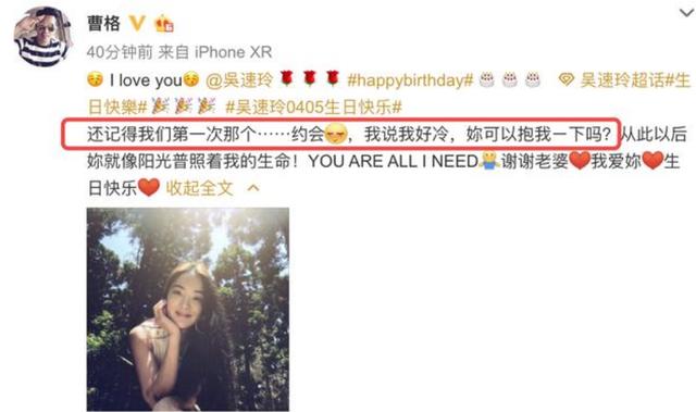 一大早曹格就开始发文为自己的老婆庆生,并且还提到两个人第一次约会的场景,超级煽情也超级有心。曹格表示自己一直爱老婆,老婆就是自己的全部,真的是宠妻狂魔。