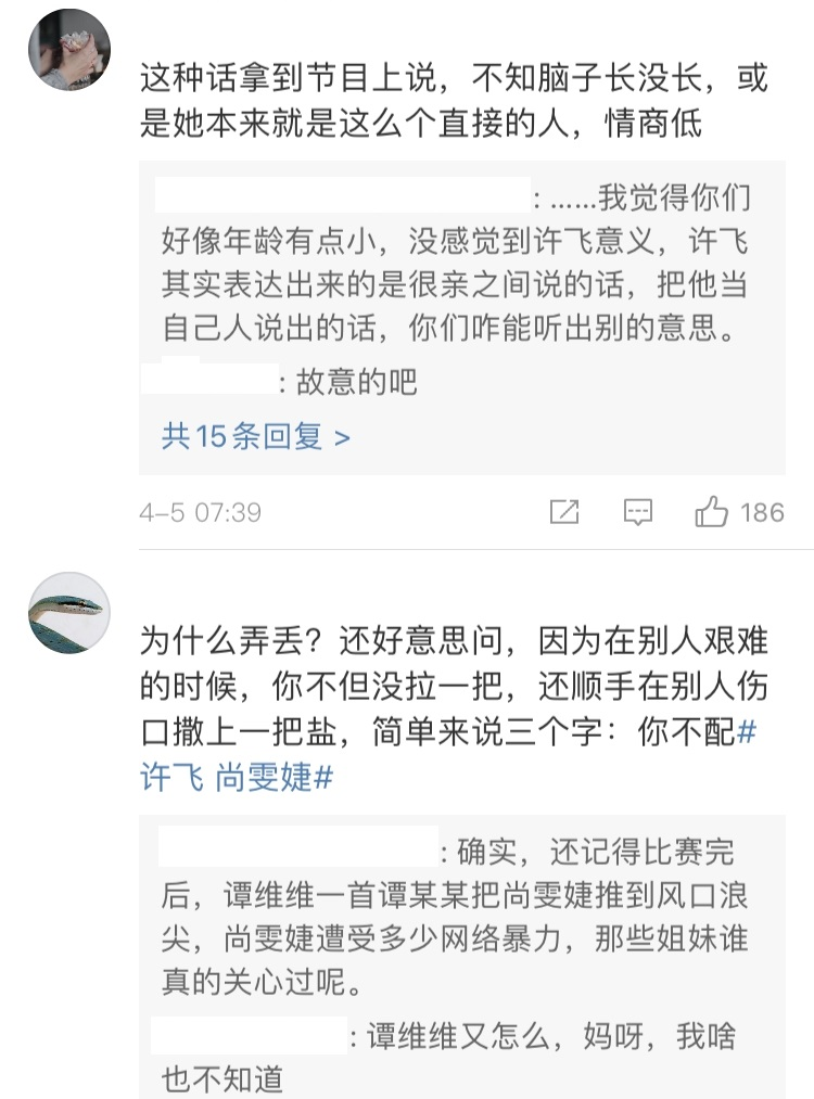 节目播出后,许飞质疑尚雯婕这一幕引来不少网友围观。很多网友对于许飞这一番声讨表示不满:这种话拿到节目上说,不知脑子长没长,或者是她本来就是这么直接的人,情商低。