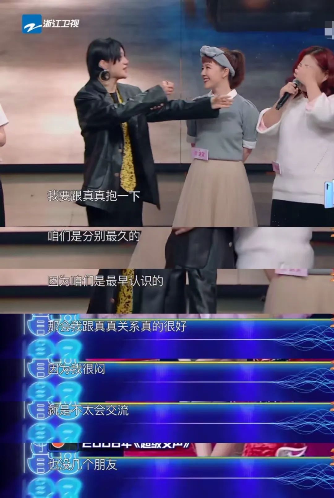 尚雯婕聊完这个话题后,节目组再次玩起了一把经典重聚的梗,请来了06年超女的前几名许飞、唐笑、厉娜和韩真真一同上台,想给主嘉宾尚雯婕一个惊喜。