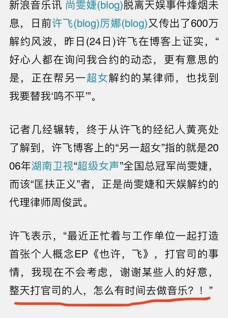 然而,许飞就讽刺过尚雯婕:“整天打官司的人,怎么有时间去做音乐。”