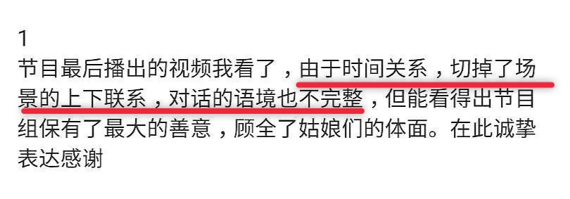 同时,节目内容也有问题。节目组切到了场景上下的联系,对话语境也不完整,眼下之意是内容被剪辑了。