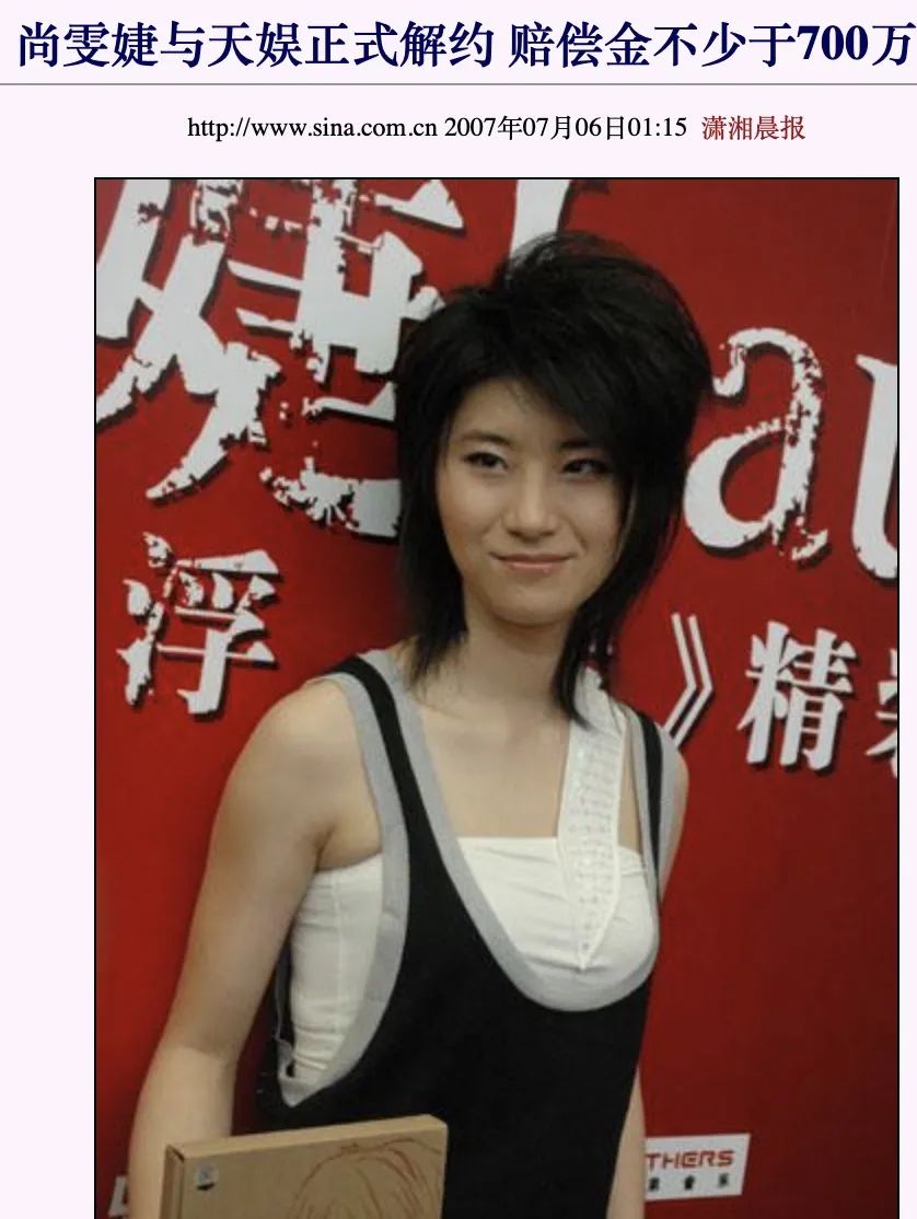 2007年尚雯婕跟天娱解约打官司,要赔偿不少于700万。当时尚雯婕事业刚有起色,很快就跌入谷底。