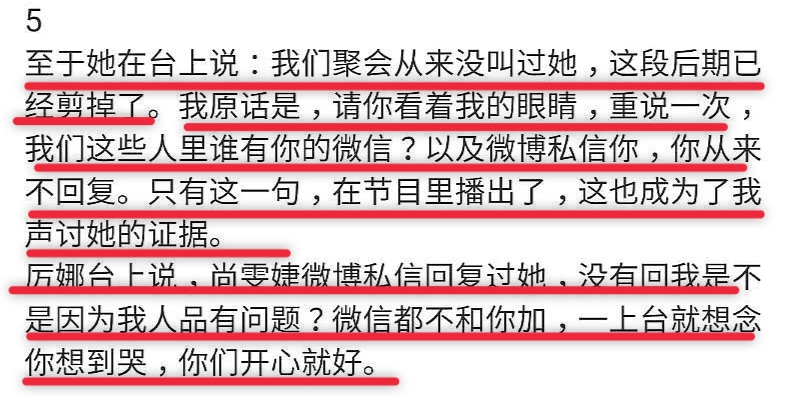 她具体还原了当时的几段被剪掉的对话,许飞表示尚雯婕曾在台上说过她们聚会没有从来没叫过她。而许飞的原话是请你看着我的眼睛,重说一次,我们这些人里谁有你的微信?以及微博私信你,你从来不回复。