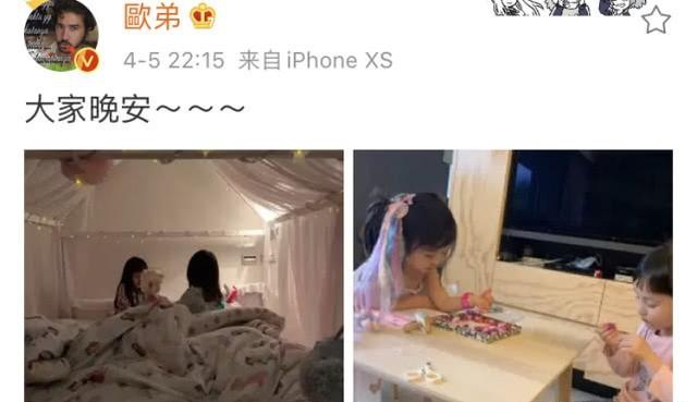 晒照之时,欧弟写道“大家晚安”,在睡前不忘为两个小公主记录下这温馨瞬间,看到女儿在一起玩耍的时光,想必身为父亲的欧弟一定幸福不已。