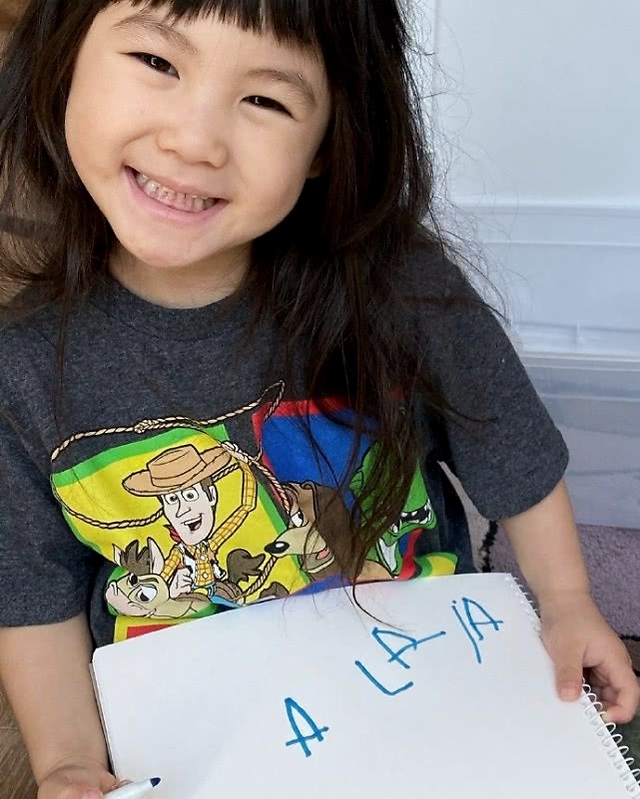 照片中,Alaia披散着凌乱的头发,留着超可爱的齐刘海,浓浓的眉毛像极了爸爸陈冠希。Alaia手里捧着自己的写字本,右手拿着笔,在本子上歪歪扭扭的写着自己的名字“Alaia”,看着自己写的名字,Alaia冲着镜头露出职业假笑,看来Alaia非常清楚自己写的字是什么样子,冲着镜头歪着头假笑可爱极了。新的一天,Alaia又是被迫营业的样子呢。