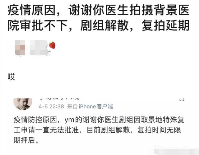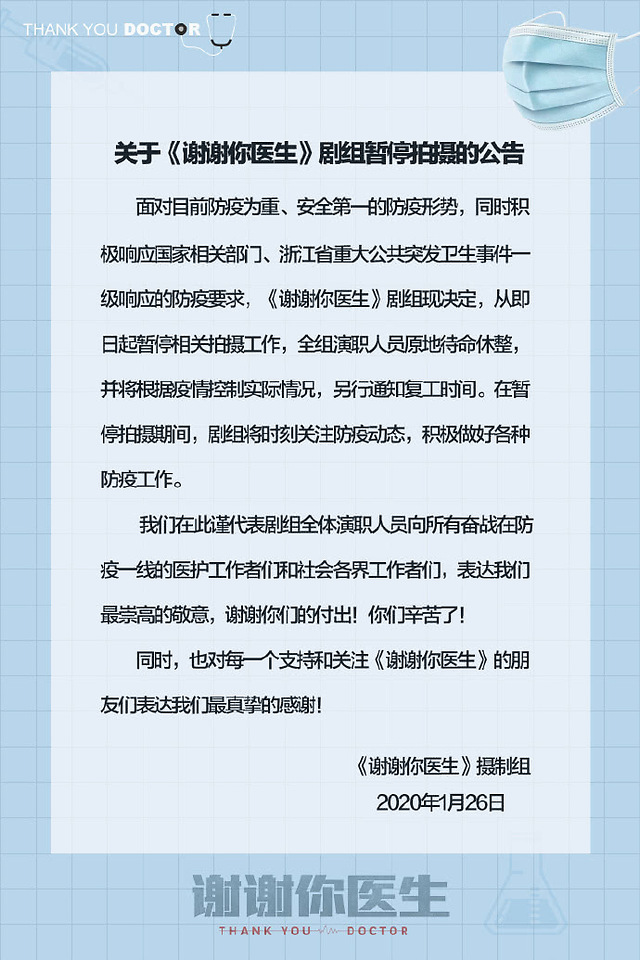 事实上,毕竟是医疗题材的剧,拍摄地点也是很大部分也会在医院进行,会占用医疗物资设备,现在疫情还没结束,只好等稳定下来再复拍。