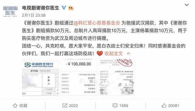 值得一提的是,《谢谢你医生》剧组通过韩红爱心慈善基金会 为驰援武汉捐款,其中《谢谢你医生》剧组捐款50万元,总制片人高琛捐款10万元,主演杨幂捐款10万元,用于购买医疗物资为武汉及周边城市进行捐赠。