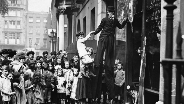 1918年大流感导致全美默片拍摄停工前,查理·卓别林踩着高跷为他的电影进行宣传。