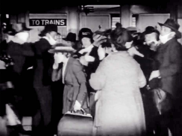 1919年玛丽·碧克馥主演的默片《长腿叔叔》中的火车站场景,一个女人打了个喷嚏,所有人都散开了,包括戴口罩的人。