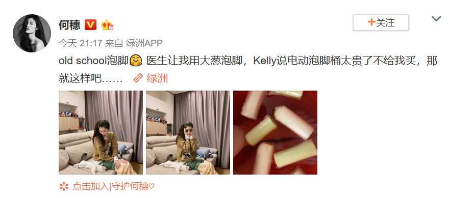 何穗在晒照的同时,也有配文写道“old school泡脚,医生让我用大葱泡脚,Kelly说电动泡脚桶太贵了不给我买,那就这样吧……”,颇有点委屈的感觉。