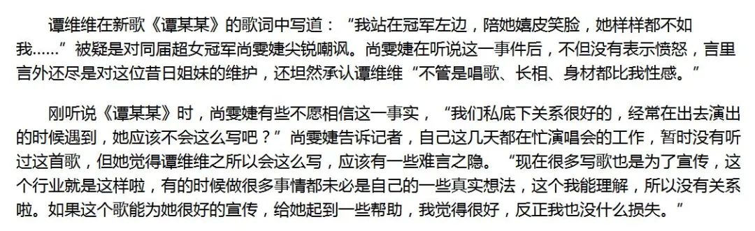 她俩的矛盾比较特别,在赛后才公开化,不过决赛宣布名次时谭维维没有一丝笑容。起因是比赛结束三年后高晓松给她写了一首歌《谭某某》,歌词里有一段直白得过分:
