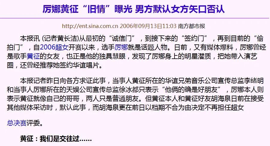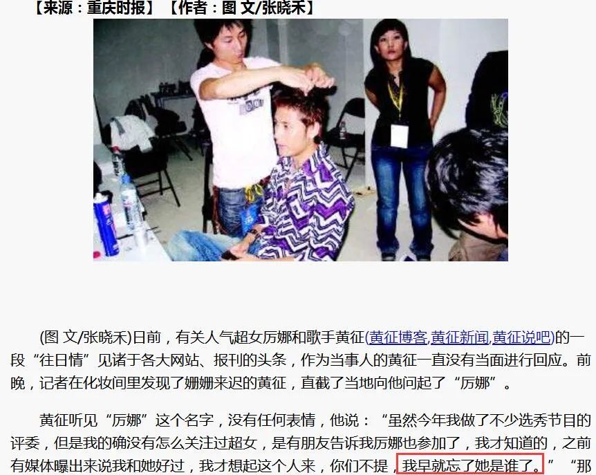 厉娜一直被黑幕说缠绕着,有报道说她是歌手黄征的前女友,她是否认了,但黄征对记者承认交往过。