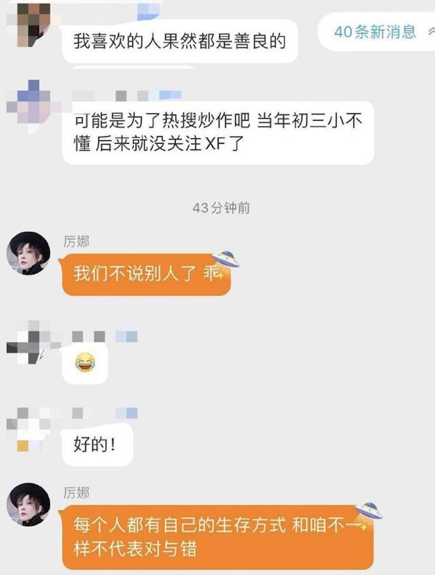 厉娜则在粉丝群里表示“我们不说别人了,乖”“每个人都有自己的生存方式,和咱不一样不代表对与错”,看起来并不想掺合此事,实际上埋怨许飞“惹事生非”。
