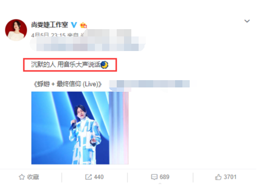 外面沸反盈天,尚雯婕不可能保持沉默啊,4月5日,她的工作室发了一条这样的微博:沉默的人,用音乐大声说话。
