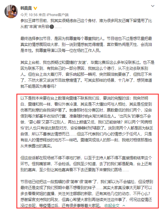 韩真真也认为尚雯婕看似外表冷漠,其实是不太懂如何与人相处,同时她还貌似嫌许飞在现场太“闹腾”,以至于其他嘉宾看不下去不得不跑来替她们圆场,主持人不得不提前结束这个环节,文章最后,她提醒网友去看唐笑的直播,支持厉娜的新歌,可整篇文章都没有提许飞的名字。