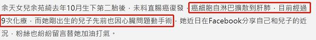 自从去年10月生下第二胎儿子后,余苑绮还没有料到直肠癌复发,之后癌细胞自淋巴扩散到肝肺,目前经过9次化疗和肺部手术的余苑绮,情况不太好,而且还自曝刚刚出生的儿子因心脏问题动手术,可以说让危在旦夕的妈妈雪上加霜。