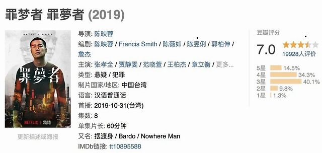 《罪梦者》和《想见你》差不多是同期,去年10月份上线,制作水准也很精细,导演是八零后,主演是金钟视后贾静雯与提名过金马影帝的张孝全。