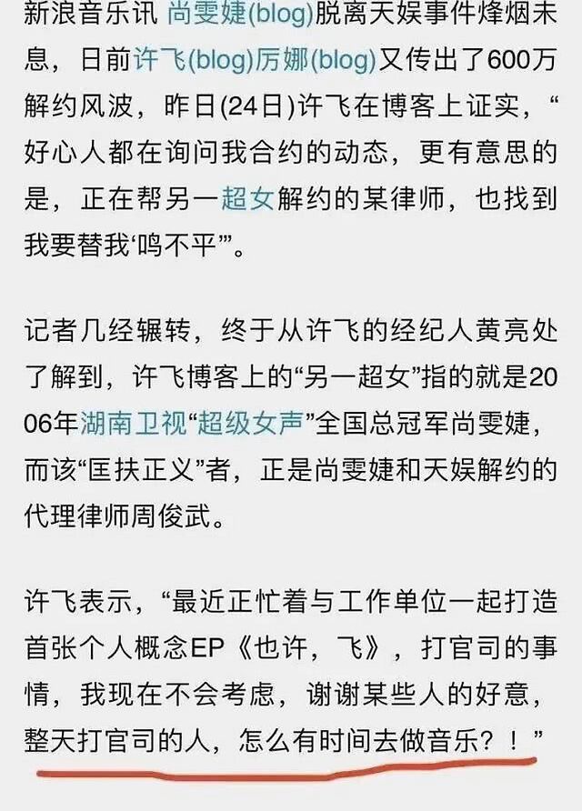 当然这些比赛PK都只算是前菜,后来尚雯婕闹到和天娱解约时才精彩,许飞在媒体前暗讽过尚雯婕,“整天打官司的人,怎么可能有时间去做音乐”,而后来尚雯婕因为这场官司要赔偿不少于700万元。